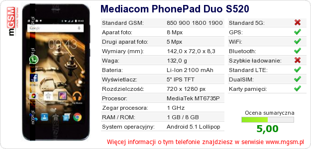 Dane telefonu Mediacom PhonePad Duo S520 na Twojej stronie