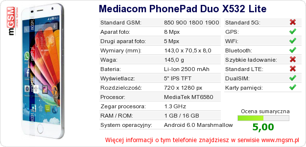 Dane telefonu Mediacom PhonePad Duo X532 Lite na Twojej stronie