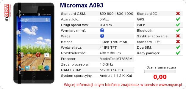 Dane telefonu Micromax A093 na Twojej stronie