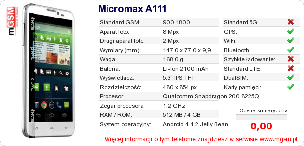 Dane telefonu Micromax A111 na Twojej stronie