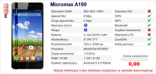 Dane telefonu Micromax A190 na Twojej stronie