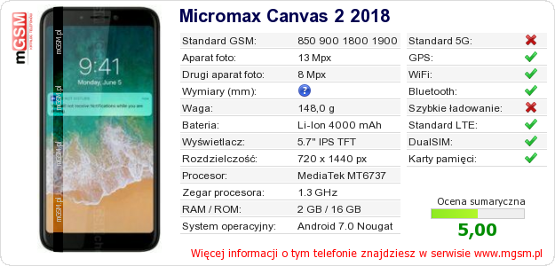Dane telefonu Micromax Canvas 2 2018 na Twojej stronie