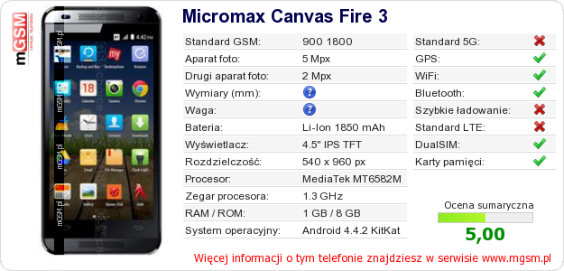 Dane telefonu Micromax Canvas Fire 3 na Twojej stronie