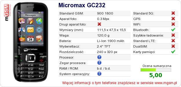 Dane telefonu Micromax GC232 na Twojej stronie