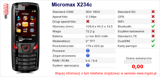 Dane telefonu Micromax X234c na Twojej stronie