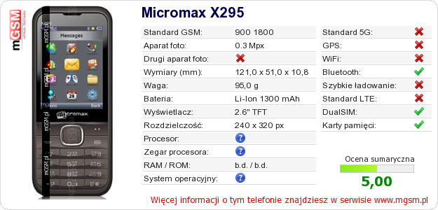 Dane telefonu Micromax X295 na Twojej stronie