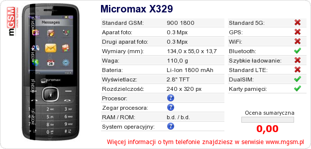 Dane telefonu Micromax X329 na Twojej stronie
