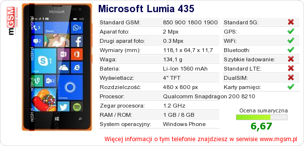 Dane telefonu Microsoft Lumia 435 na Twojej stronie