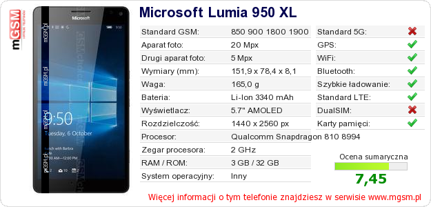 Dane telefonu Microsoft Lumia 950 XL na Twojej stronie