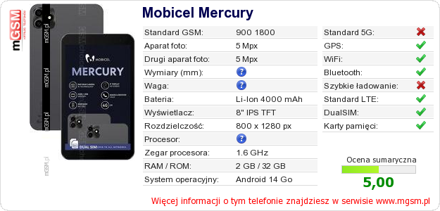Dane telefonu Mobicel Mercury na Twojej stronie