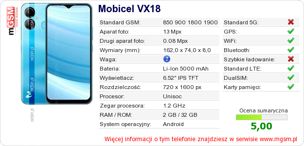 Dane telefonu Mobicel VX18 na Twojej stronie
