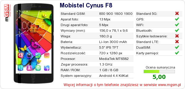Dane telefonu Mobistel Cynus F8 na Twojej stronie