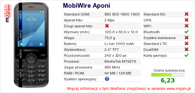 Dane telefonu MobiWire Aponi na Twojej stronie