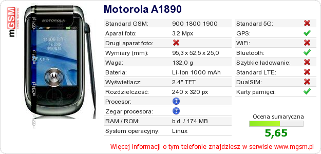 Dane telefonu Motorola A1890 na Twojej stronie
