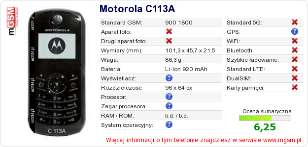Dane telefonu Motorola C113A na Twojej stronie