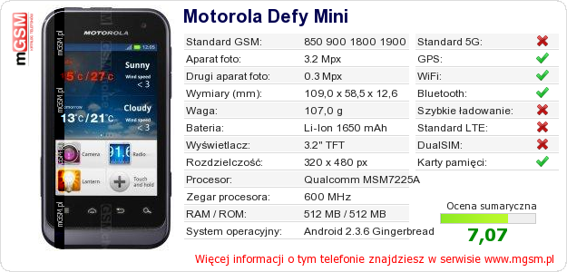 Dane telefonu Motorola Defy Mini na Twojej stronie