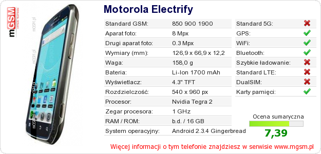 Dane telefonu Motorola Electrify na Twojej stronie