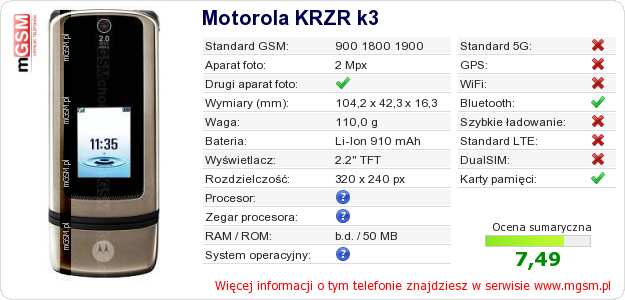 Dane telefonu Motorola KRZR k3 na Twojej stronie