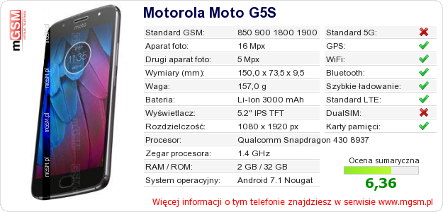 Dane telefonu Motorola Moto G5S na Twojej stronie