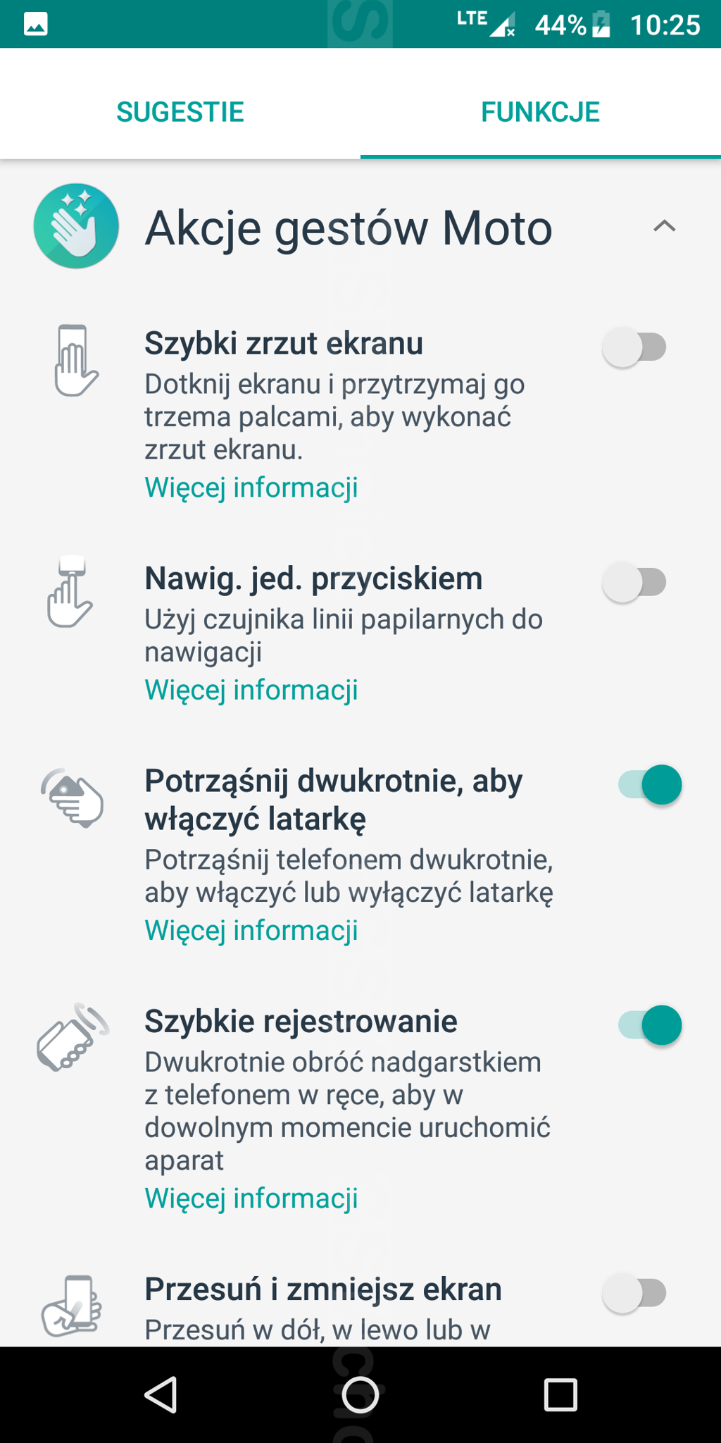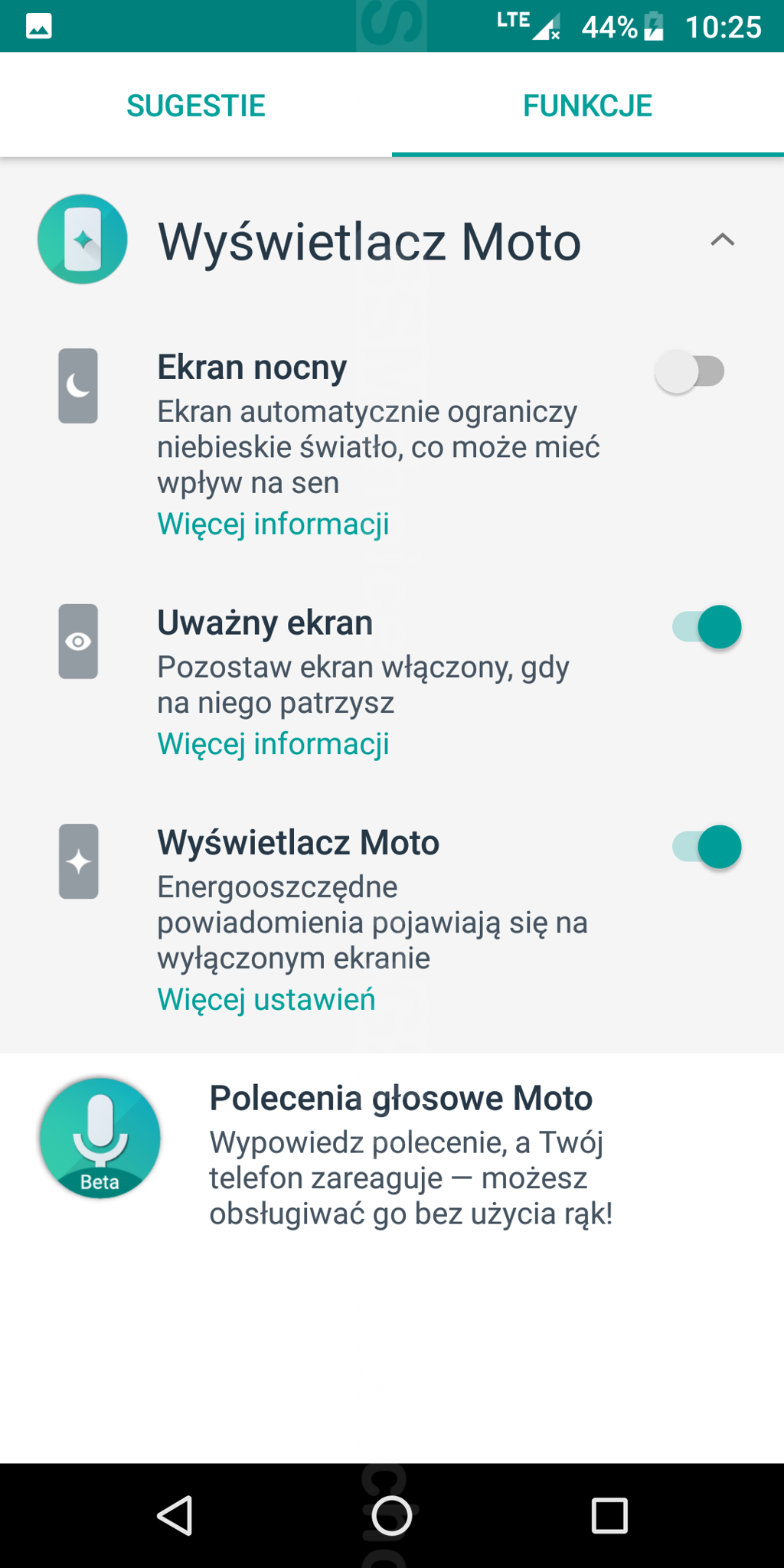 Kilka słów warto napisać o aplikacji Moto, która zasadniczo zwiększa funkcjonalność softu. Pierwsza z funkcji to Moto Key, dzięki której można uzyskać dostęp do witryn internetowych, aplikacji i urządzeń przy pomocy odcisku palca (oraz Lenovo ID). Druga funkcja to Akcje gestów Moto, która umożliwia zastosowanie określonych gestów do szybkiego zrzutu ekranu, włączenia latarki, szybkiego uruchomienia aparatu, zmniejszenia ekranu do obsługi jedną ręką i in. Pozwala też na nawigowanie po systemie przy pomocy czytnika linii papilarnych (zamiast korzystania z przycisków ekranowych). Kolejna z funkcji aplikacji Moto to Wyświetlacz Moto - w tej zakładce znajdziemy filtr światła niebieskiego (tj. Ekran nocny), pozostawienie włączonego ekranu, gdy użytkownik się na niego patrzy (tj. Uważny ekran) i konfigurację energooszczędnych powiadomień na wyłączonym ekranie. Ostatnia z funkcji to Polecenia głosowe Moto - ale nie ma obsługi języka polskiego.