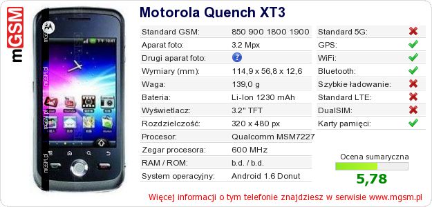 Dane telefonu Motorola Quench XT3 na Twojej stronie