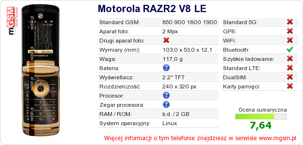 Dane telefonu Motorola RAZR2 V8 LE na Twojej stronie