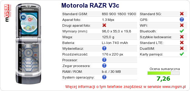 Dane telefonu Motorola RAZR V3c na Twojej stronie