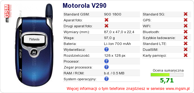 Dane telefonu Motorola V290 na Twojej stronie