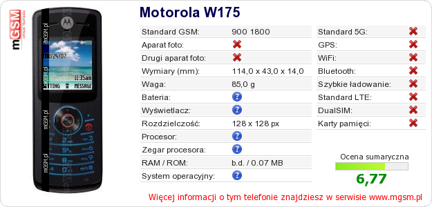 Dane telefonu Motorola W175 na Twojej stronie