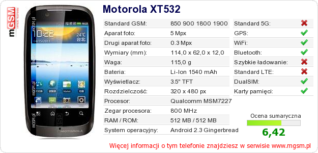 Dane telefonu Motorola XT532 na Twojej stronie