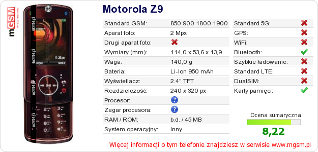 Dane telefonu Motorola Z9 na Twojej stronie