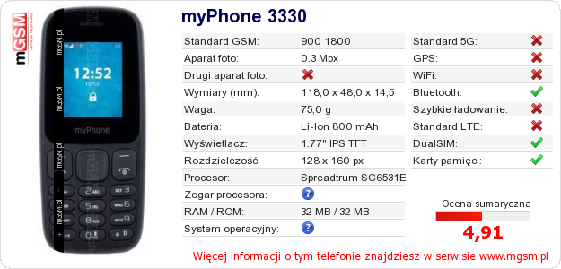 Dane telefonu myPhone 3330 na Twojej stronie