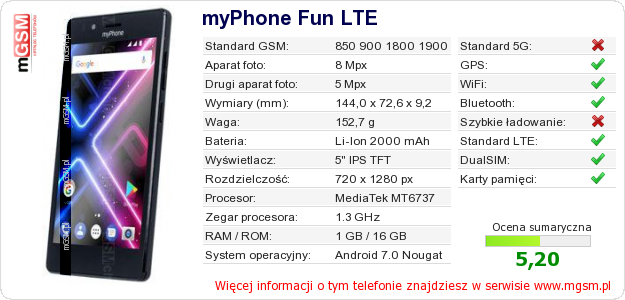 Dane telefonu myPhone Fun LTE na Twojej stronie