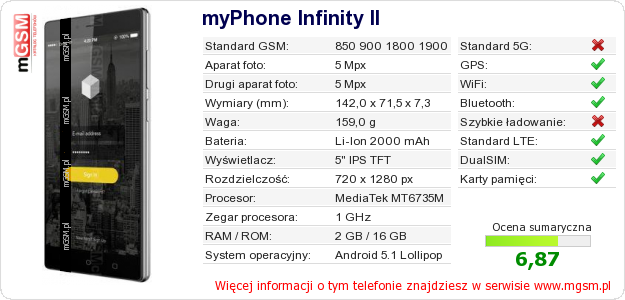 Dane telefonu myPhone Infinity II na Twojej stronie