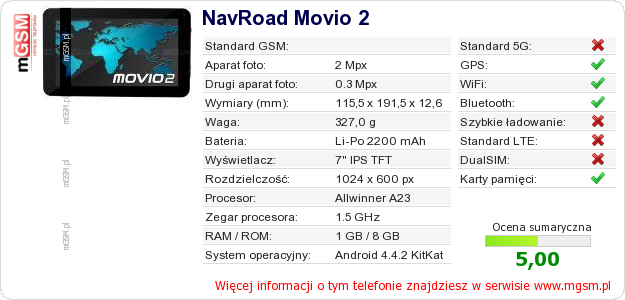 Dane telefonu NavRoad Movio 2 na Twojej stronie