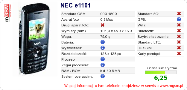 Dane telefonu NEC e1101 na Twojej stronie