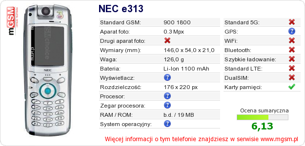 Dane telefonu NEC e313 na Twojej stronie