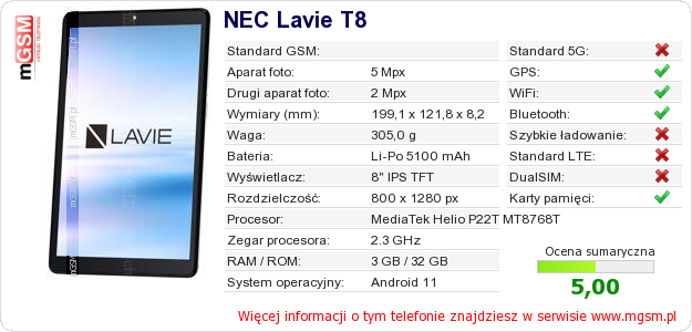 Dane telefonu NEC Lavie T8 na Twojej stronie