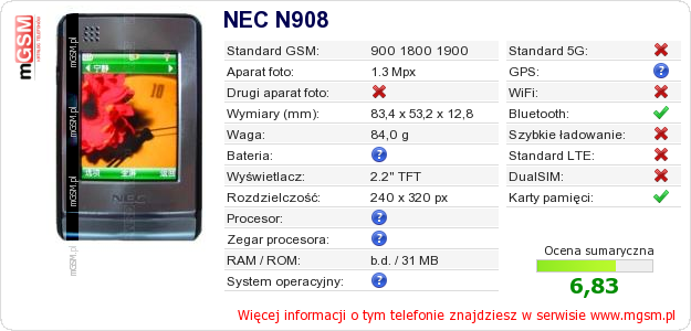 Dane telefonu NEC N908 na Twojej stronie