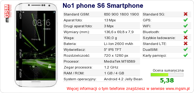 Dane telefonu No1 phone S6 Smartphone na Twojej stronie