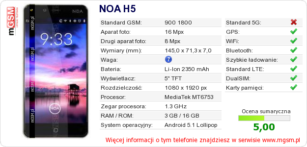 Dane telefonu NOA H5 na Twojej stronie