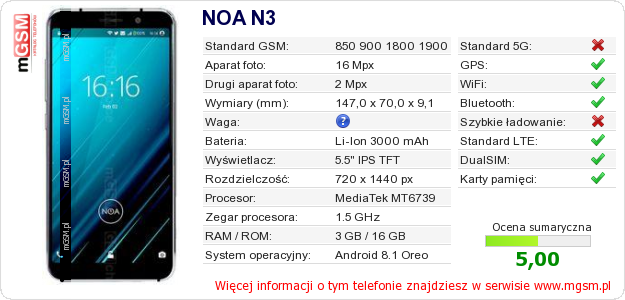 Dane telefonu NOA N3 na Twojej stronie