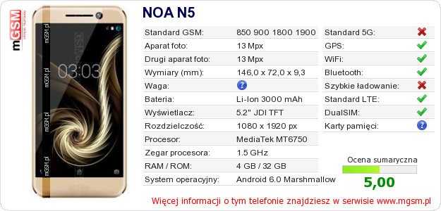 Dane telefonu NOA N5 na Twojej stronie