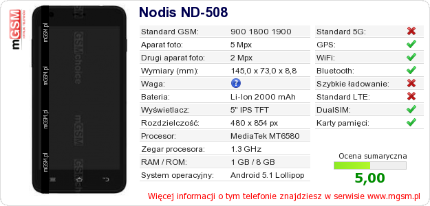 Dane telefonu Nodis ND-508 na Twojej stronie