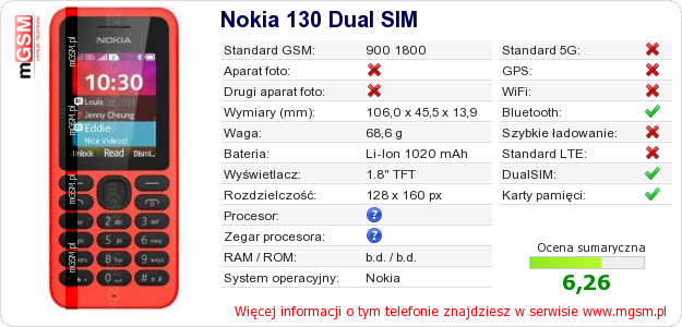 Dane telefonu Nokia 130 Dual SIM na Twojej stronie