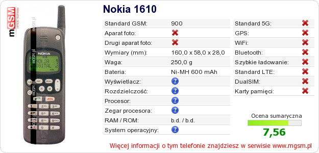 Dane telefonu Nokia 1610 na Twojej stronie