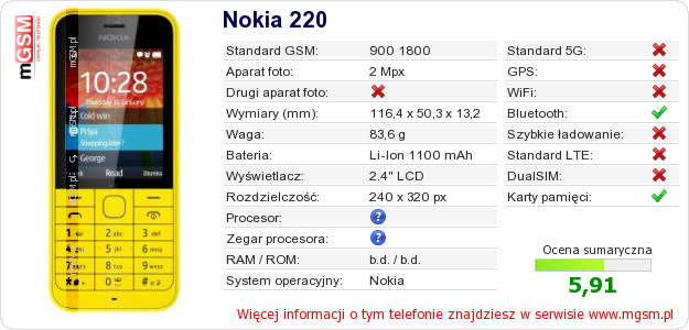 Dane telefonu Nokia 220 na Twojej stronie