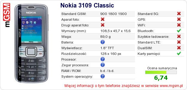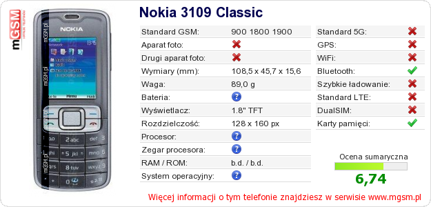 Dane telefonu Nokia 3109 Classic na Twojej stronie