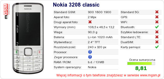 Dane telefonu Nokia 3208 classic na Twojej stronie