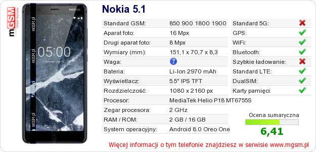 Dane telefonu Nokia 5.1 na Twojej stronie
